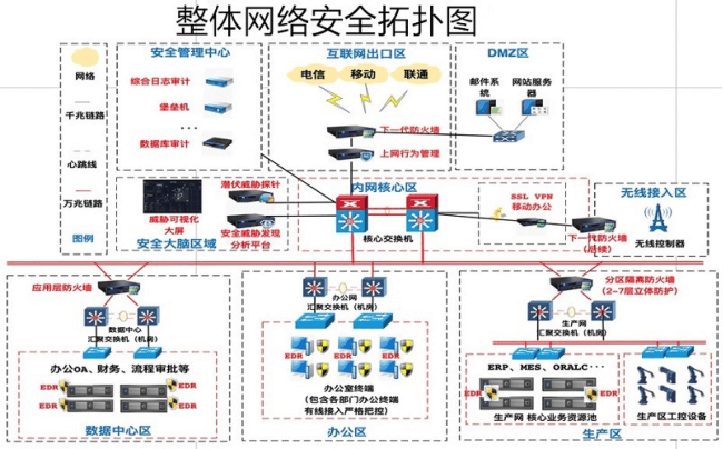 1)安全域划分:集团网络划分成办公网、研发网、生产网,数据中心网,通过下一代防火墙实现网络的逻辑隔离和安全防护。
